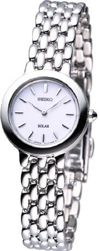 Seiko Women's SUP019 Solar Silver Dial Watch Stainless steel case with a stainless steel link bracelet. Fixed stainless steel bezel. White dial with silver-tone hands and index hour markers. Solar quartz movement. Scratch resistant Hardlex crystal. Textured silver-tone crown. Solid case back. Case diameter: 24.8 mm. Case thickness: 6.3 mm. Push button clasp. Water resistant at 50 meters / 165 feet. Seiko Dress White Dial Solar Quartz Ladies Watch SUP019